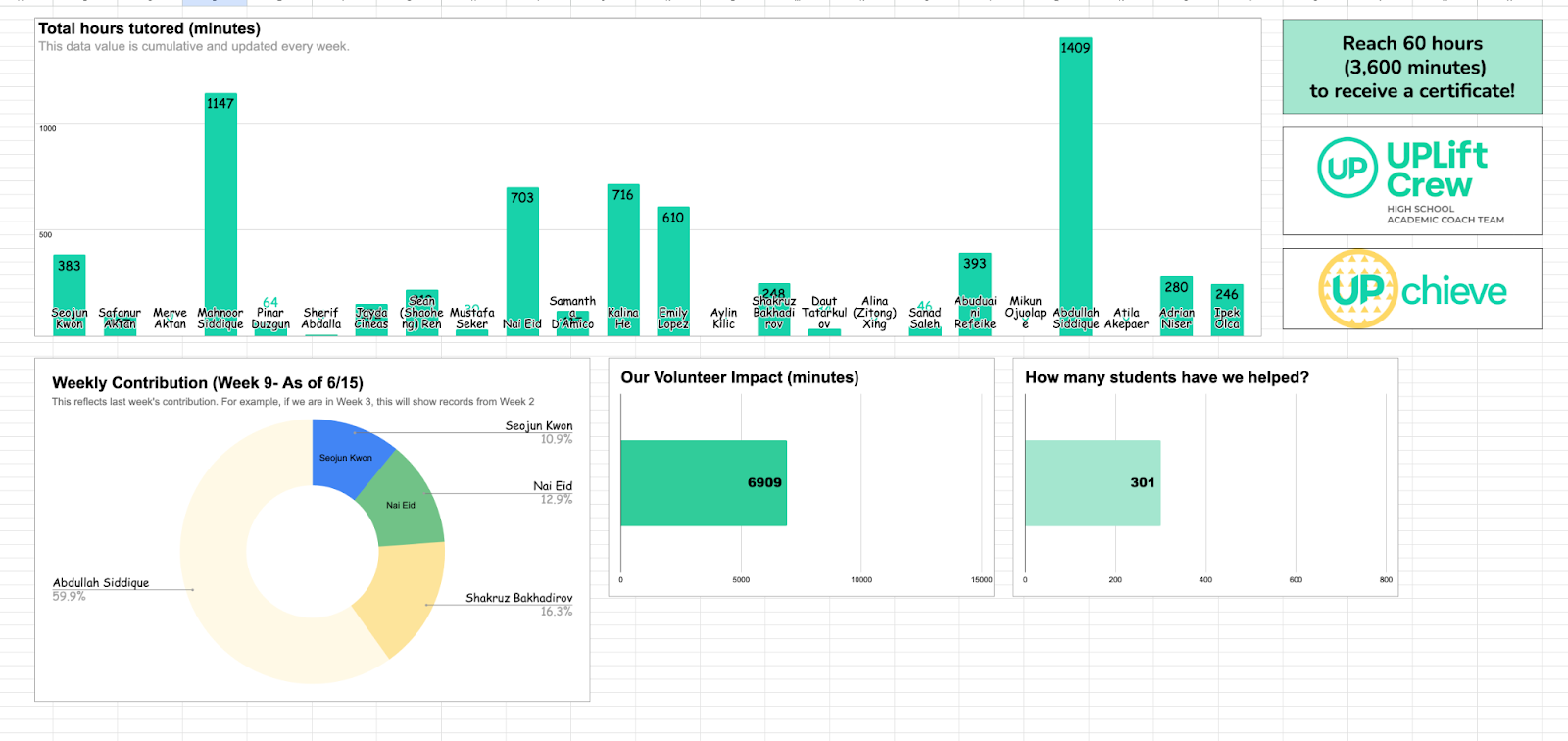 To make volunteering progress more engaging, I created a graphic dashboard. Using our spreadsheet data, I built charts that show both individual and team totals. Members can see how many hours they’ve contributed and compare with friends in a spirit of healthy competition. This simple visual tool really motivates us to tutor more.