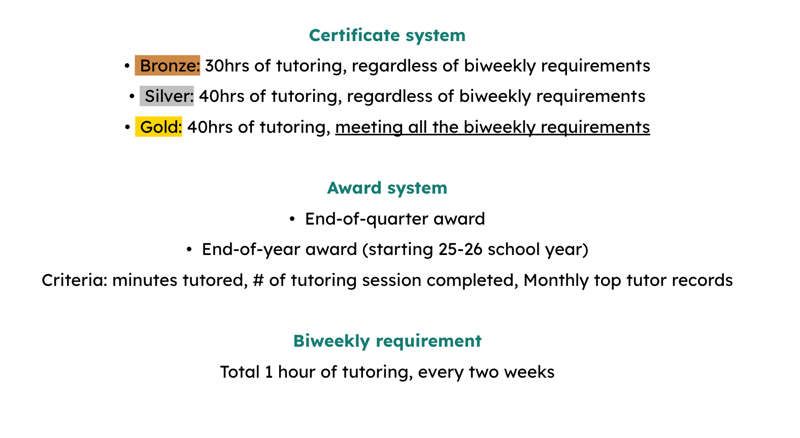 Participation Requirements: Members tutor for at least 1 hour every 2 weeks. We track this on a shared spreadsheet. Not meeting the requirement doesn’t remove them from the team, but it does affect eligibility for awards.